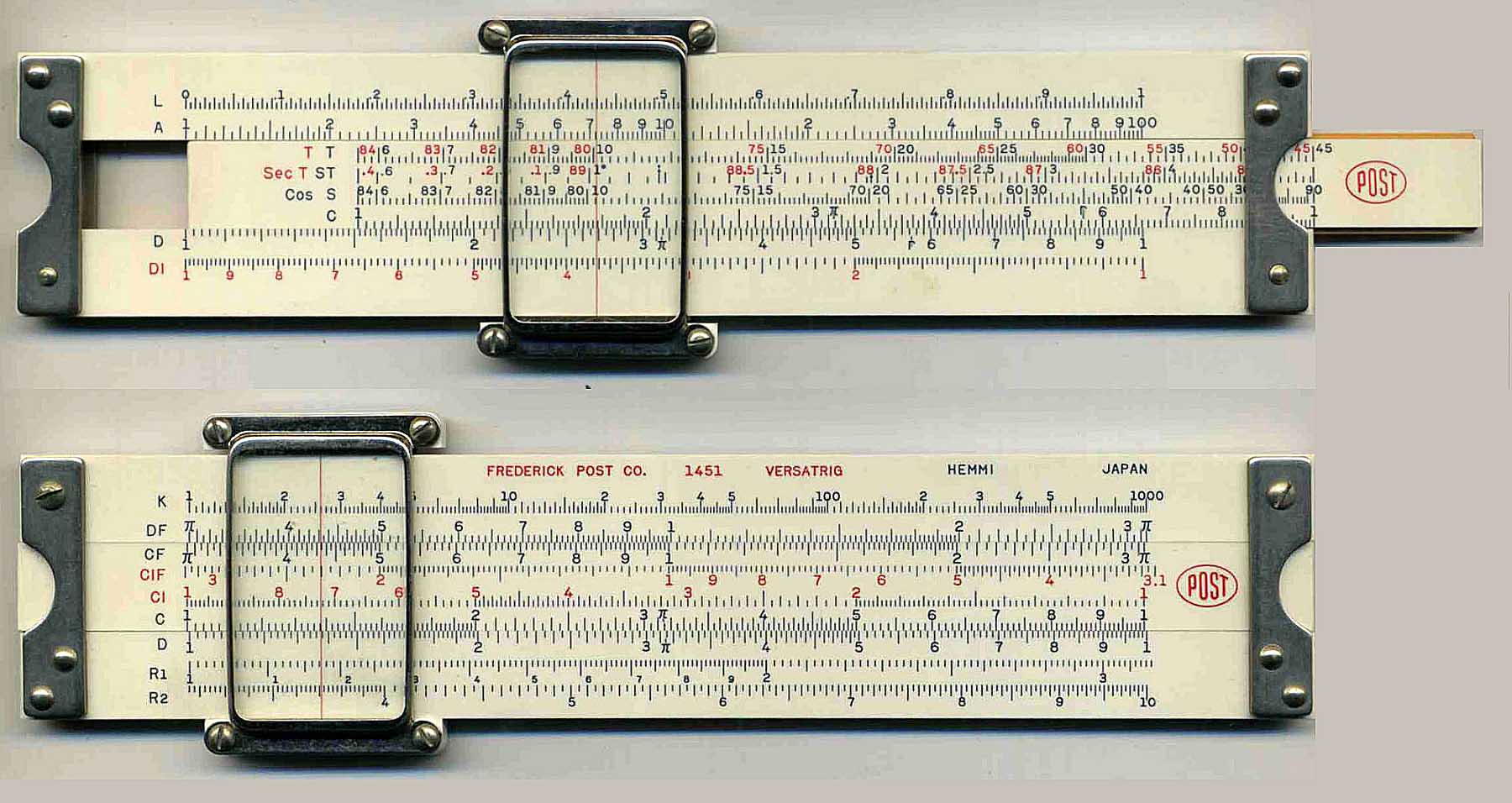 Post 1451 VersatrigUSA (made in Japan by Hemmi for Post), c. 1957+, duplex, 12.5 cm scales, celluloid on bamboo, very rare
