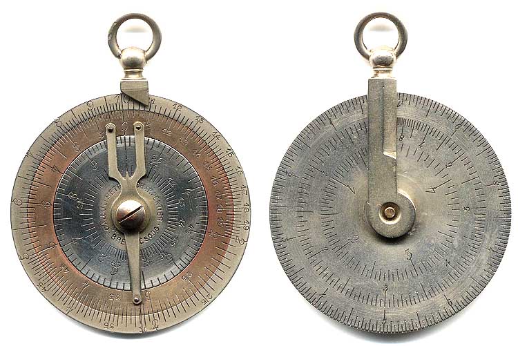 Charpentier Calculimetre France, 1892-1931, a circular rule 2 3/8" in diameter made from steel and brass.