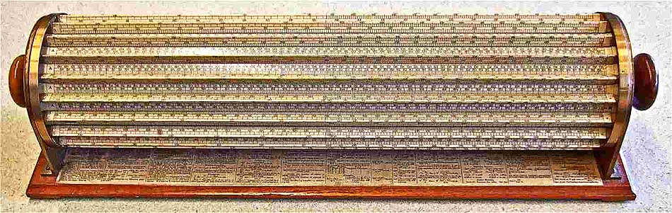 Invented by Edwin Thacher in 1878, this unique ribbed cylindrical calculator is 4" diameter and 18" long, providing logarithmic scales of 30 feet length and four to five digit accuracy.
